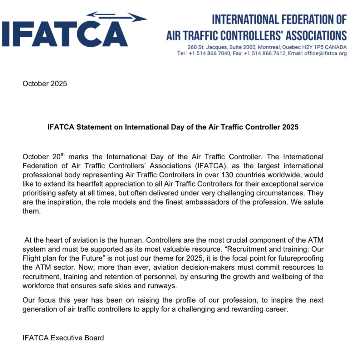 Once again, I wish all of you an amazing International Day of the Air Traffic Controller for 2025 and thank you to all those that will join me on shift on the 20th, as we all know the traffic never stops.
